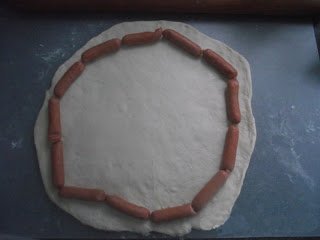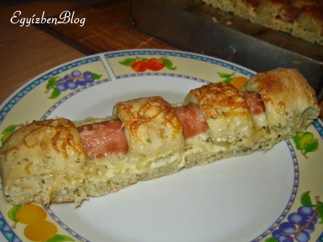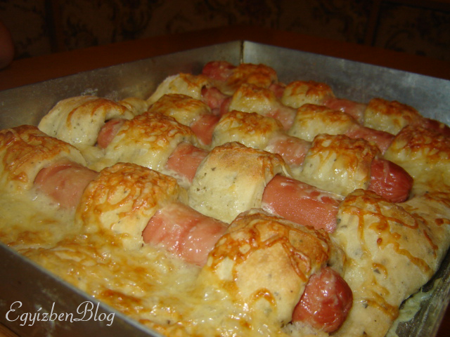 Az alapanyagokból a virsli, 1 tojás kivételével kelesztő tálban tésztát gyúrok,majd lefedve duplájára kelesztem.
