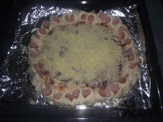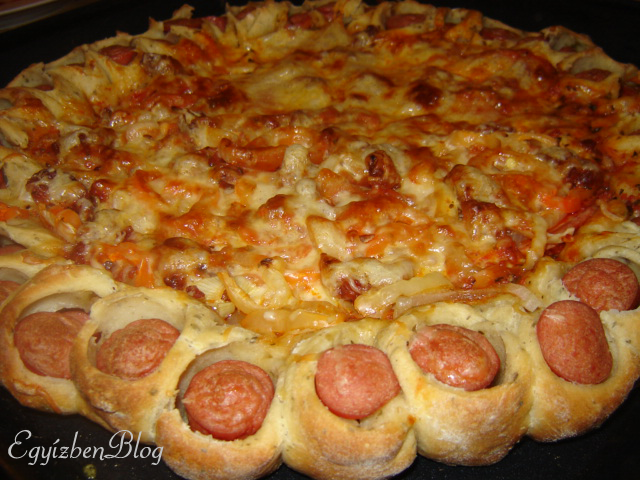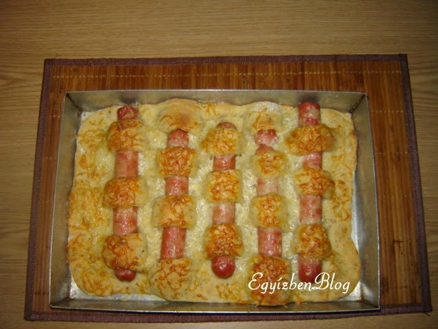 Majd a tészta csíkok közé félbevagdosott virsliket szövögetek.