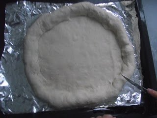 Ezután a tepsi méretének megfelelőre kinyújtom.(Én 32×36 cm-ben sütöttem.) A kinyújtott tésztát beleteszem az olajjal kikent tepsibe. Ezután hosszanti irányban a szélső 2cm-ek kihagyásával derelye vágóval elvagdosom a tésztát.