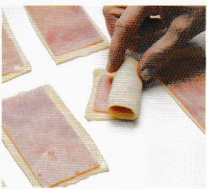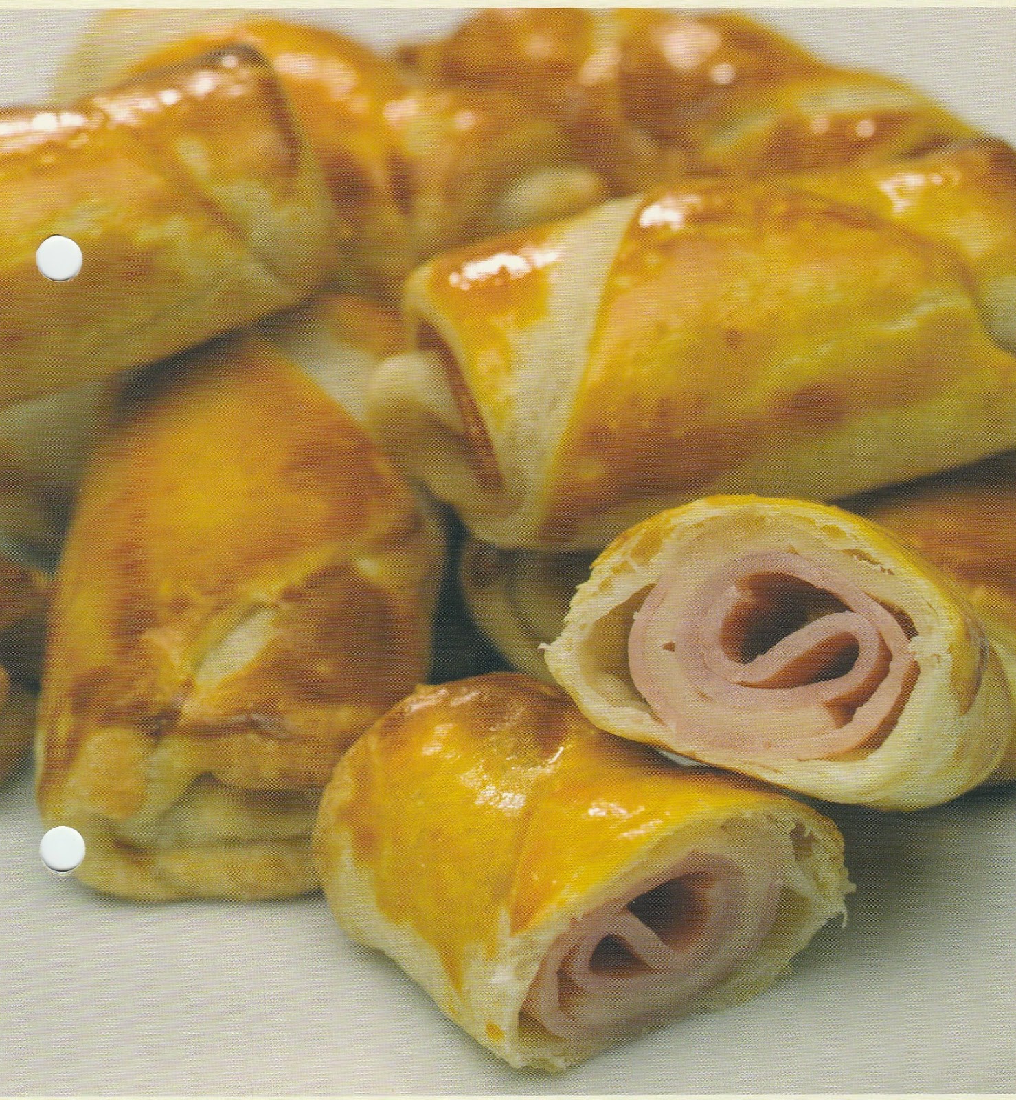 A tésztát kinyújtjuk,10×6 cm-es téglalapokra vágjuk,és mindegyikre egy szelet gépsonkát fektetve összecsavarjuk.A tekercseket a simára kevert tojással megkenjük,majd 50 percig állni hagyjuk.